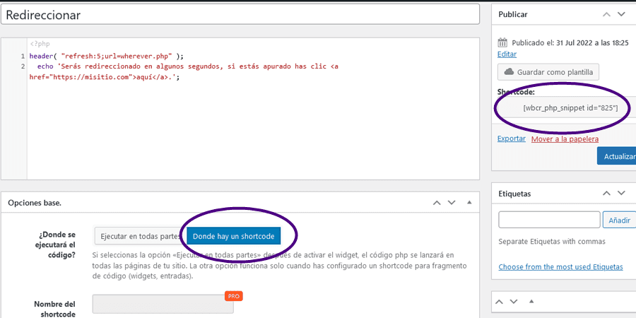 El sitio estaba maquetado con Elementor, así que he ido a Woody Snippets, he agregado el código, dejando seleccionada la opción “Donde hay un shortcode“.